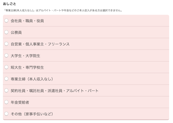 先述したように職業による申し込み制限はありません。エポスカードの申込フォームの職業項目では「その他(家事手伝い)」という選択項目すらあるので、主婦(無職or専業主婦)の人であっても申し込みができます。
