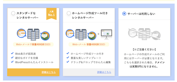 また、サーバーは利用しないの注意事項には「ドメインは実質0円になりません」との記述が。そのため、不安を煽るような記述があるため、人気No1を押してしまうのかもしれませんね。