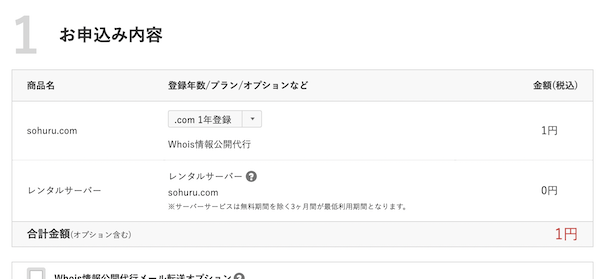 ドメイン費用は1円かかりますが、初回のレンタルサーバーの請求から