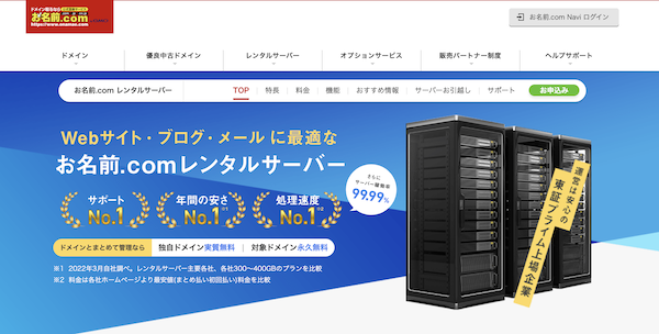 お名前.comといえばドメインを取得できる老舗WEBサービスの印象が強いですよね。実はここ最近ではレンタルサーバーも展開するようになり、ドメイン利用料の軽減を抱き合わせにサーバーを使われる方も増えています。