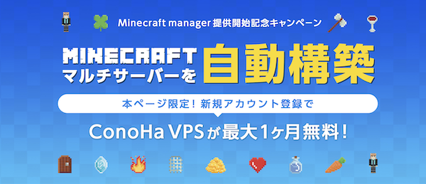 9月16日の18時までに新規アカウント登録すると自動構築されたマイクラマルチサーバーが1ヶ月無料で利用することができます。お試しで使ってみたい、ConoHaVPSサーバーに決めているといった人はこのお得きかんを逃さないようにしましょう。