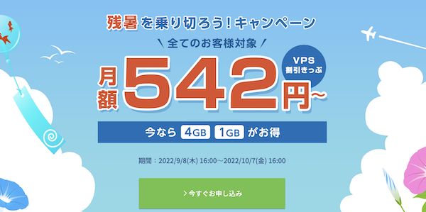 10月7日(金)16時までにVPS割引きっぷを購入すると最安月額542円になるキャンペーンを実施中。安定したスペックを確保したい場合は4GB、初めてVPSを扱ってみたい方は1GBを選ぶと良い。(どちらも最大23%オフなのでお得!)
