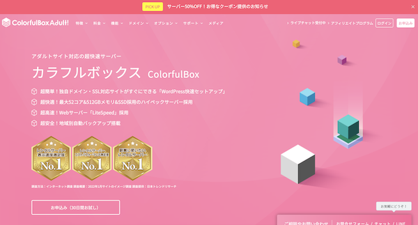 カラフルボックスはアダルトサイト対応と通常の2種類に分かれています。通常(青ビジュアル)ではアダルトコンテンツは禁止されているので、アダルトコンテンツを扱う場合はピンク色の方を選ぶようにしましょう。